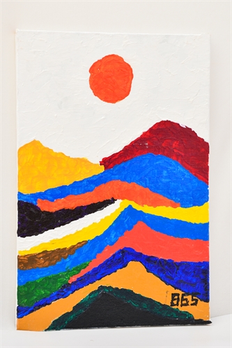 Abaixo do sol, uma sequência de montanhas coloridas se sobrepõe em camadas orgânicas e onduladas. Cada faixa de cor - azul, amarelo, vermelho, verde, laranja, preto e tons terrosos - cria ritmo, profundidade e movimento. A composição lembra as gravuras tradicionais japonesas, mas com uma abordagem contemporânea e mais vibrante.