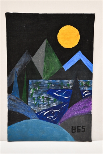 "Montanha de Noite" apresenta uma paisagem geométrica envolta em escuridão, iluminada apenas pelo brilho intenso de um grande astro amarelo que domina o céu. O contraste entre o fundo negro e o disco luminoso cria imediatamente a atmosfera noturna, destacando as formas das montanhas e da água.