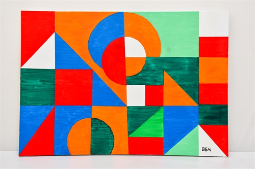 "Intersecções Geométricas" é uma composição vibrante construída a partir da convivência entre formas puras - círculos, triângulos, quadrados e retângulos - que se encontram, se sobrepõem e dialogam entre si. Cada área de cor parece ocupar seu espaço com intenção, criando um mosaico dinâmico onde as formas não competem, mas se complementam.