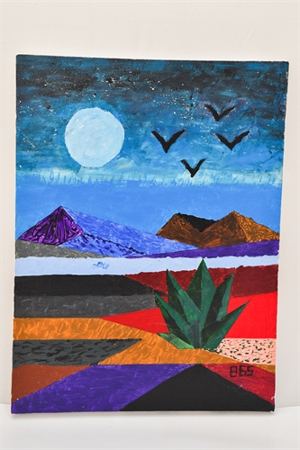 "Pássaros à Noite" apresenta uma paisagem noturna intensa, onde a luz branca da lua ilumina discretamente montanhas, vegetação e camadas de terra colorida. O céu profundo, marcado por nuances azuladas e pinceladas que sugerem movimento, acolhe o voo dos pássaros que atravessam a cena, trazendo vida ao silêncio da noite.