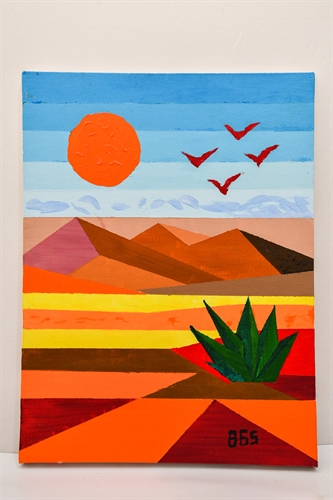"Pássaros de Dia" apresenta uma paisagem quente e luminosa, marcada por tons terrosos, laranjas vibrantes e amarelos que evocam o calor do deserto sob o sol forte. No céu, o grande sol em destaque domina a cena, enquanto os pássaros em pleno voo atravessam o horizonte azul, trazendo movimento e contraste à composição.