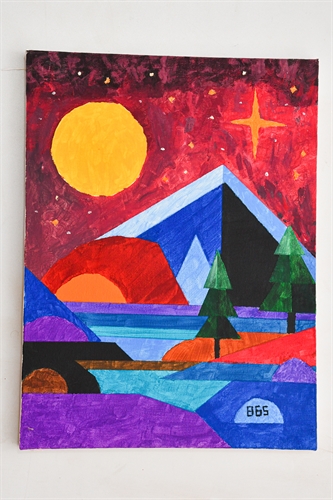 Os pinheiros funcionam como guardiões dessa passagem, enquanto as áreas coloridas em roxo, azul e laranja lembram caminhos, colinas e terrenos desconhecidos que convidam à exploração. Cada forma e cada cor contribui para a impressão de que algo extraordinário está prestes a acontecer.