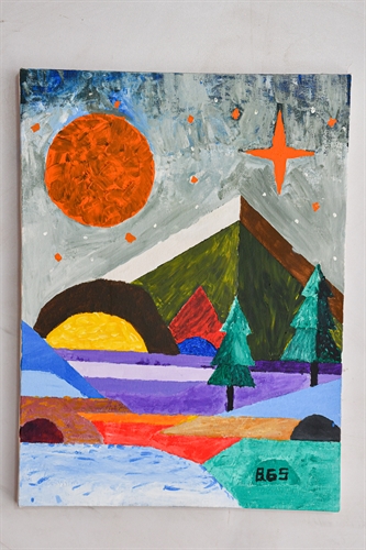 "Partindo de Nárnia" transmite a sensação de despedida de um mundo mágico, como se o olhar estivesse dando um último passo antes de atravessar o portal de volta. O céu acinzentado, marcado por pinceladas vibrantes e pontos de luz alaranjados, cria um clima de mistério que mistura fantasia e melancolia.