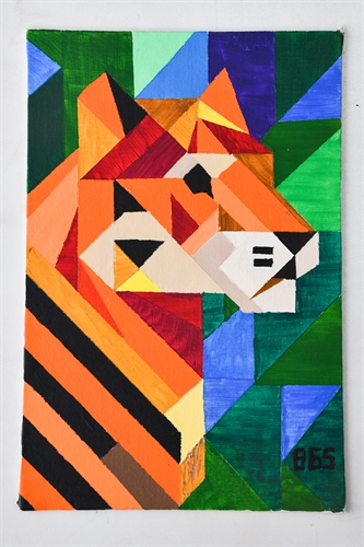 Os tons de laranja, preto e marrom reforçam a aparência clássica do tigre, enquanto o fundo em verdes e azuis acrescenta contraste e profundidade. As formas angulares sugerem movimento e energia, como se o animal estivesse atento ao ambiente ao seu redor.