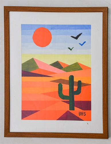 "Pássaros Livres no Céu" retrata um cenário desértico estilizado por meio de formas geométricas e cores intensas. A composição combina terras em tons quentes - laranjas, rosas e vermelhos - criando uma paisagem vibrante que transmite calor, amplitude e movimento. O cacto ao primeiro plano reforça a identidade do ambiente árido, enquanto as montanhas facetadas ao fundo adicionam profundidade e ritmo visual.