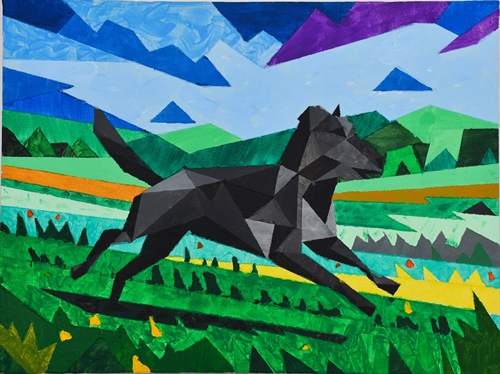 A obra traduz essa memória afetiva através de um corpo geométrico, construído em planos facetados de tons grafite, preto e cinza, dando ao animal uma aura quase escultural, forte e indomável, como se sua essência permanecesse intacta no tempo.