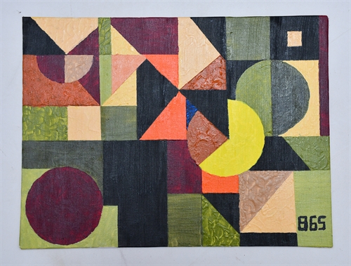 A obra de textura mais evidente da série. Verdes, ocres, amarelos e tons terrosos constroem um ambiente que remete a uma paisagem natural reinterpretada pela geometria. A superfície revela camadas de matéria pictórica, trazendo profundidade sensorial. É uma pintura que combina terra e forma, estrutura e organicidade, encerrando a série com densidade e serenidade.