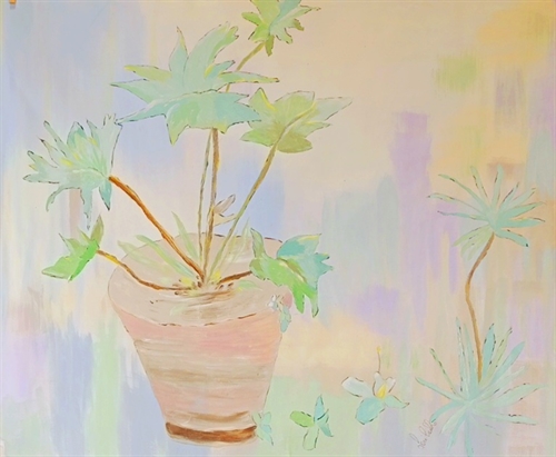Uma pintura em tons pastéis claros, onde é retratado de forma não realista um vaso de cerâmica com uma planta.