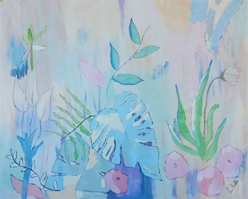 Tela com plantas multicoloridas abstratas inspiradas nas corês e luzes do jardim botânico.