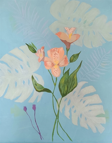 Pintura acrílica sobre tela com motivos botânicos, de uma flor sobre um fundo, pintado com formas claras e translúcidas.
