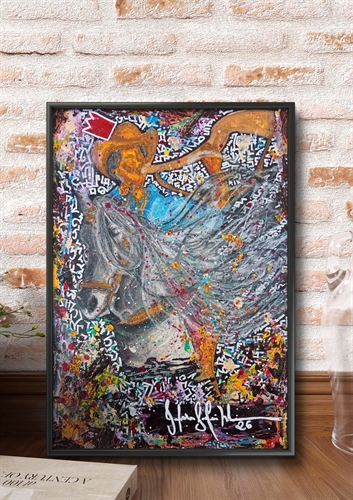O Canto do Rei Cavaleiro retrata um homem montado a cavalo tocando berrante, figura simbólica que representa o chamado, a liderança e a conexão entre homem, animal e território. A coroa flutuante sobre o personagem transforma a cena cotidiana em imagem mítica, elevando o peão à condição de rei.