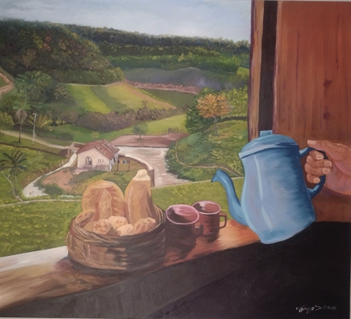 Pintura seis da manhã com tema amanhã na casa, retrata uma cena de um café da manhã, com uma linda paisagem ao fundo mostrando um campo e água.