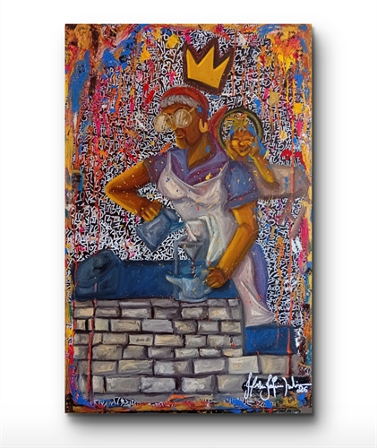 A figura da avó surge coroada, elevando o afeto e a tradição familiar à condição de realeza. O café, o fogo e o olhar admirado constroem uma narrativa sobre ancestralidade, herança cultural e o sagrado presente nos pequenos rituais da vida simples.