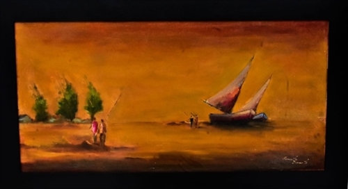 Esta pintura apresenta uma paisagem litorânea em atmosfera quente e contemplativa. Sob um céu dourado de fim de tarde, um barco de pesca repousa na água calma enquanto figuras humanas caminham pela areia, sugerindo o cotidiano simples da vida à beira-mar. As velas inclinadas e os tons ocres criam uma sensação de vento suave e silêncio do entardecer. A composição privilegia a atmosfera e a luz, buscando transmitir serenidade, memória e a relação entre o homem e o mar.
