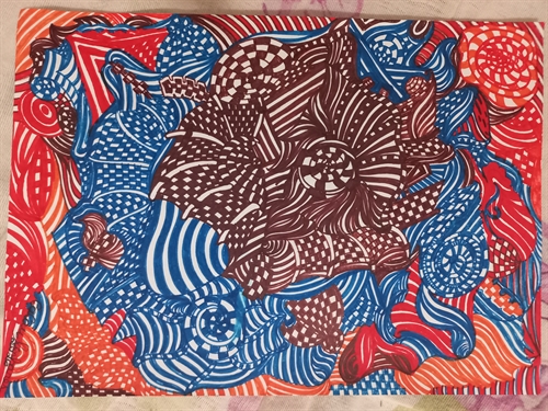 Este desenho abstrato explora movimento, repetição e textura através de formas orgânicas que se entrelaçam pelo papel. No centro, uma composição em tom marrom forma uma espécie de flor ou espiral complexa, construída com padrões geométricos como quadriculados, listras e curvas.