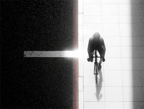 A imagem mostra o movimento solitário do ciclista. Quase abstrata, utiliza as condições de luz para criar efeitos visuais impactantes, focando na forma e na textura e guiando o olhar do espectador para a luz.