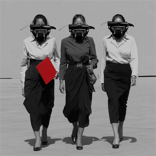 A obra apresenta uma crítica visual à transição tecnológica iniciada na década de 1970. Através da fusão entre o vestuário da época e dispositivos que ocultam o rosto, a imagem simboliza a integração entre o ser humano e o microprocessador, sugerindo o início de uma simbiose que redefine a identidade e a visão.