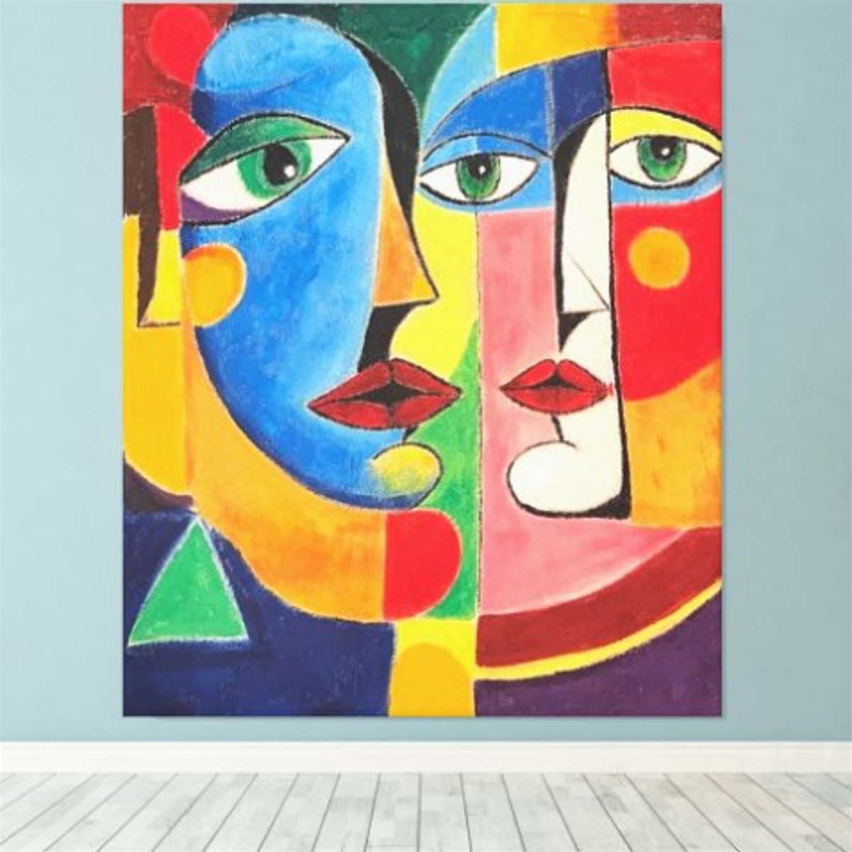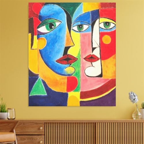 This captivating masterpiece, titled Intertwined Identities, is an original acrylic painting on canvas by renowned artist Mary G. Exploring the complexity of human relationships through a contemporary Cubist and abstract aesthetic, the piece presents two faces that merge into a vibrant geometric composition. The bold use of primary and secondary colors—deep blues, intense reds, radiant yellows, and vivid greens—creates a rich visual dialogue about the connection and duality of the soul.