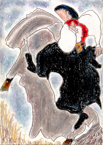 Descrição: Cavaleiro gaúcho açoitando seu cavalo Crioulo
