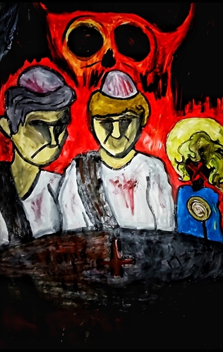 Num momento como esse, a obra transmite a devastação e a distorção de valores humanos. A figura mostra duas figuras de estatus, com vestimentas de papas, ensaguentadas. A cruz virada para eles é o que eles pensam que estão fazendo em nome da religião. A menina ao lado mostra a inquietante visão das atrocidadedes que os personagens fizeram. Com tonalidades vermelhas e pretas não para ser sobre o amor mas pela dor.