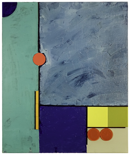 São figuras gerando uma abstração geométrica, em equilíbrio com o espaço – regular e imperfeito. Os objetos ganham forma e peso. Há diálogo entre a cor, o movimento, o volume e a textura – Pintura.