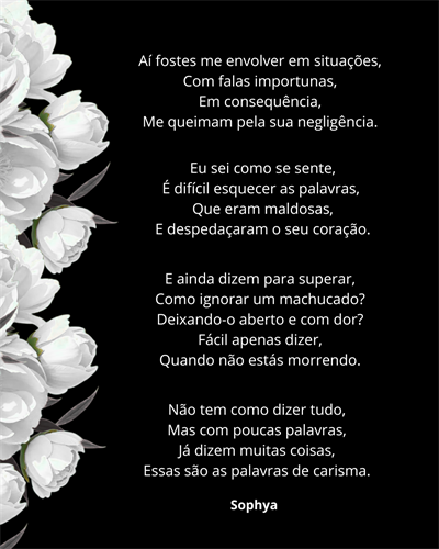 "Palavras de Carisma" é uma exploração poética sobre a incompreensão e a negligência emocional. O poema dá voz à dor de ser julgado por sentimentos que os outros não conseguem mensurar, questionando a facilidade com que o mundo pede superação enquanto ignora as feridas abertas. É um desabafo sobre a solidão de não ser ouvido.